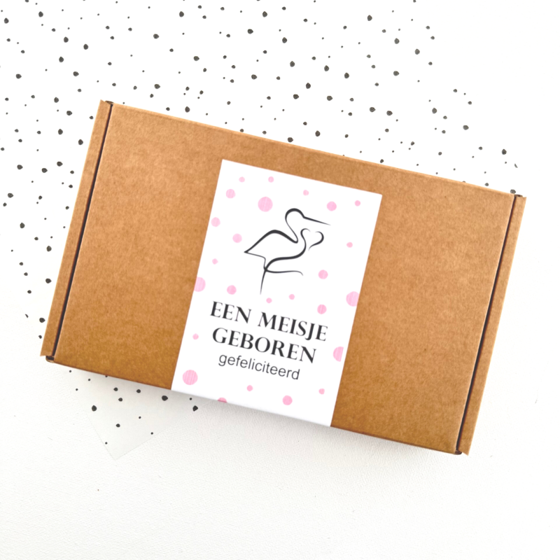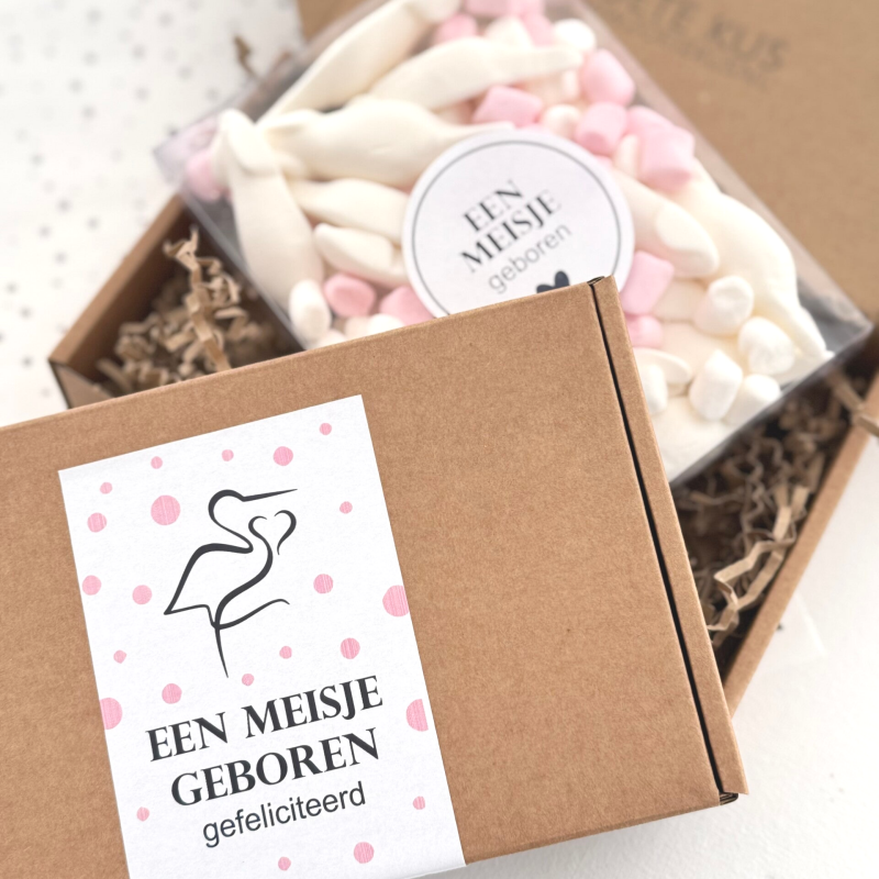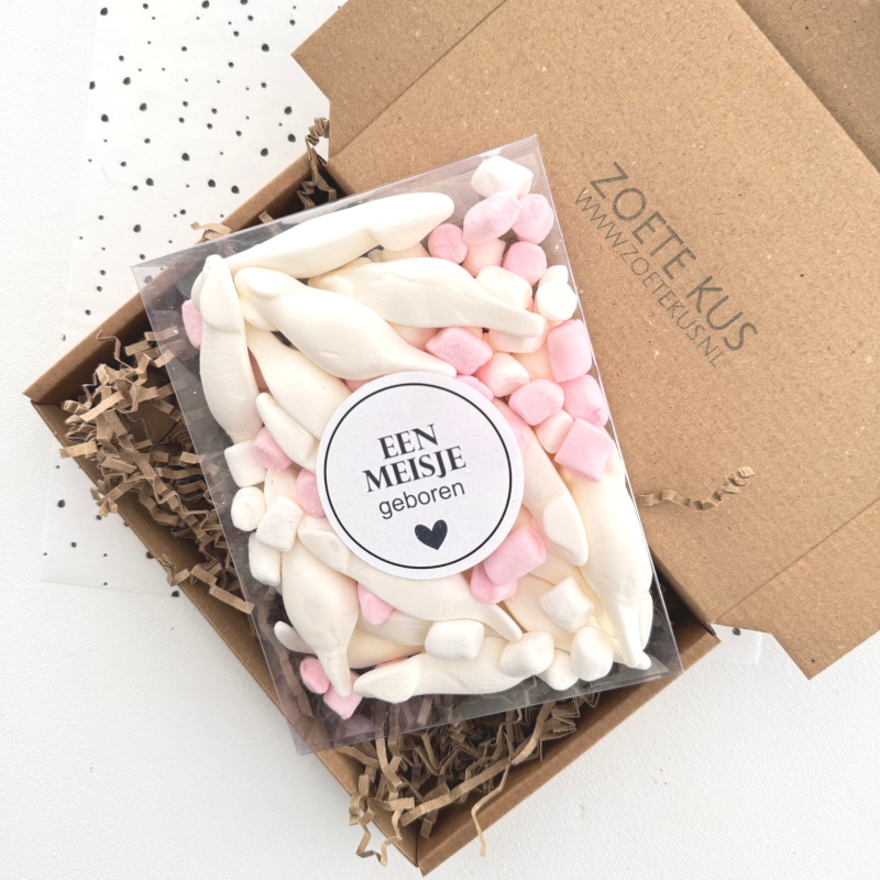Vier de komst van een prachtig klein meisje met deze feestelijke snoepbox! Gevuld met een heerlijke mix van roze en witte snoepjes, perfect brievenbus cadeautje om iemand te feliciteren met de geboorte van een dochter.